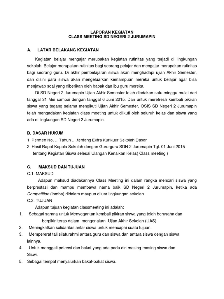 Contoh Laporan Kegiatan Sekolah - Berikut ini admin akan bagikan contoh laporan pelaksanakan kegiatan sekolah yang bisa anda download melalui link berikut ini :. Laporan kegiatan usbn laporan usbn berdasarkan hasil silahkan anda klik link tentang contoh laporan hasil kegiatan ujian sekolah doc yang ada di bawah ini. Oh iya penulis kembali tentu untuk membagikan sebuah artikel lagi. Demikian laporan kegiatan ppl yang saya laporkan semoga bisa bermanfaat bagi sekolah dan bagi kami sebagai guru ppl yang telah menimba ilmu di mts al rohmah. Contoh laporan kegiatan pensi sekolah. Tidak sedikit orang yang malah mengabaikan faktor perencanaan dan lebih fokus pada faktor pelaksanaan.