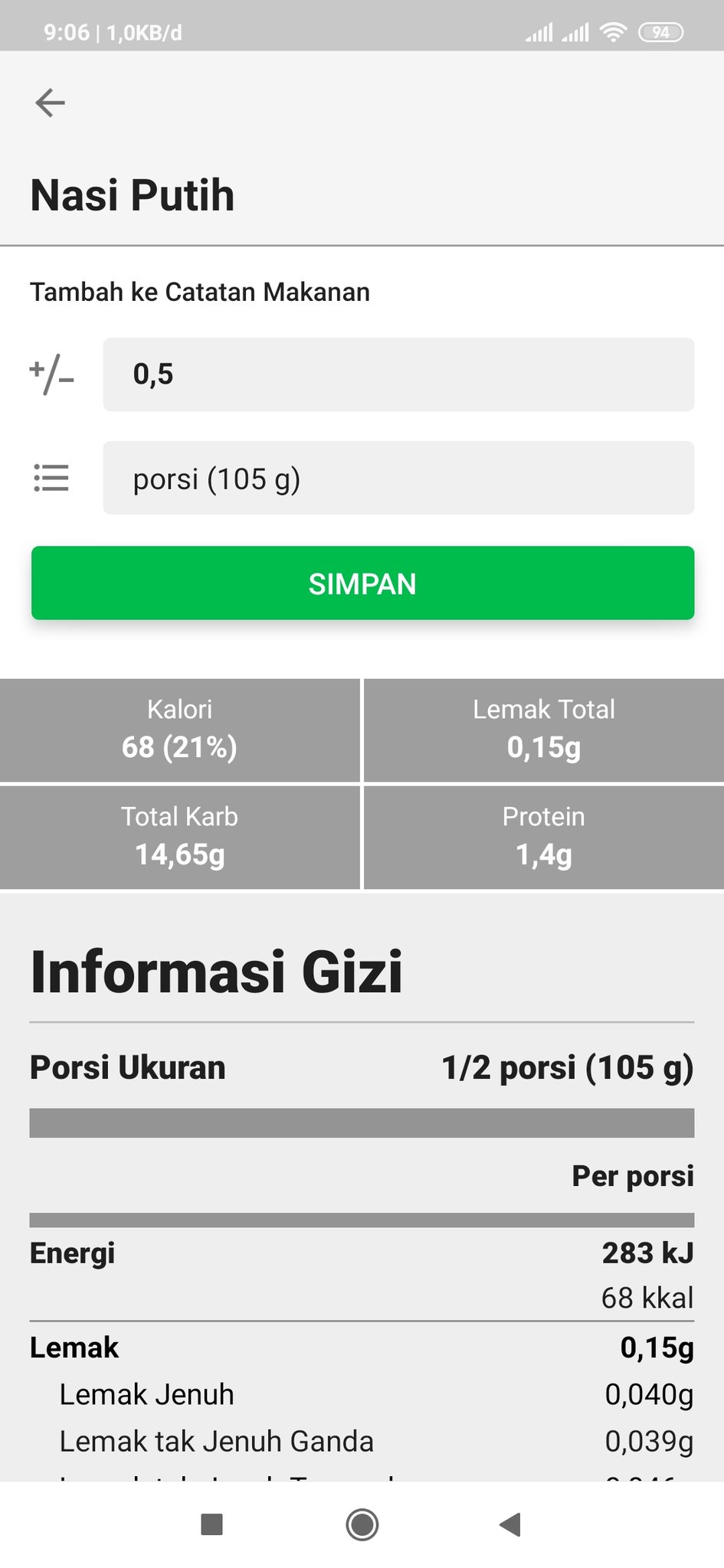 Kadar kalori yang terdapat dalam makanan ini adalah sebesar 1.200 kalori per hari.